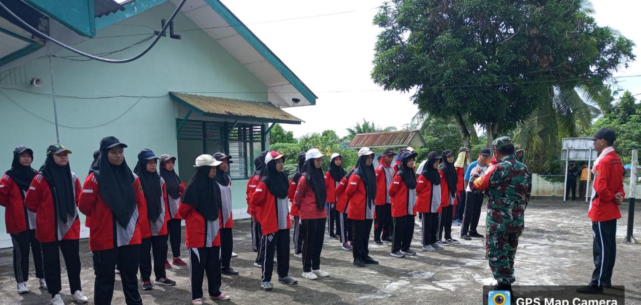 DUMAI (MR) - Serda Roni Sandra selaku Babinsa dari Koramil-02 melatih para Pelajar dari SMKN 3 di halaman Kantor Koramil 02/BK Jalan Agenda Kelurahan Bukit Nenas Kecamatan Bukit Kapur, (22/1).
