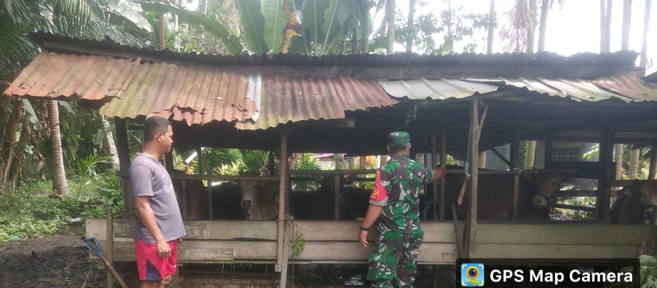 DUMAI (MR) - Babinsa Kelurahan Bagan besar Serma Zul Efendi melaksanakan pemantauan ternak untuk mencegah Penyakit Mulut dan Kuku (PMK) di salah satu peternakan milik masyarakat, (24/1).