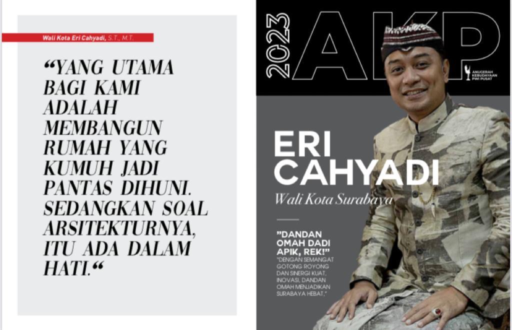 Saat presentasi di kantor PWI Pusat, Wali Kota yang gemar main ludruk dan menari Remo, mengenakan ikat kepala gaya arek Suroboyo, dengan busana dengan warna dasar abu, bersandal kulit. Selalu tersenyum, dengan lesung pipit menghias pipinya. Pengganti Tri Rismaharini itu, sangat menguasai persoalan perumahan khususnya rutilahu dengan program Dandan Omah Apik Rek.