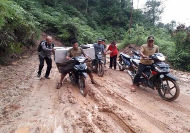 Bukan saja jauhnya jarak yang harus mereka tempuh, namun kondisi jalan yang berlumpur serta sulit dilalui, membuat mereka harus bergantian mendorong sepeda motor yang mengangkut logistik Pilkada ini menuju daerah penugasannya.