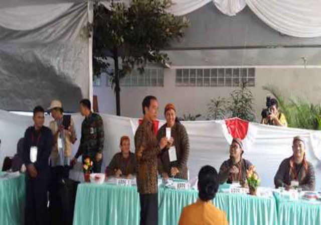 JAKARTA (MR) - Presiden Joko Widodo (Jokowi) bersama sang isteri Iriana Joko Widodo tiba di Tempat Pemungutan Suara (TPS) Gambir 4, Jakarta, sekira pukul 10.00 WIB. Keduanya merupakan DPT dengan nomor urut 269-270 di lokasi.