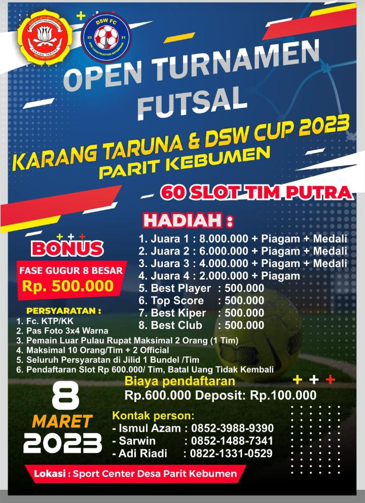 Turnamen ini bakal dilaksanakan 8 Maret mendatang di lapangan Sport Center Desa Parit Kebumen memperebutkan hadiah total puluhan Juta Rupiah.