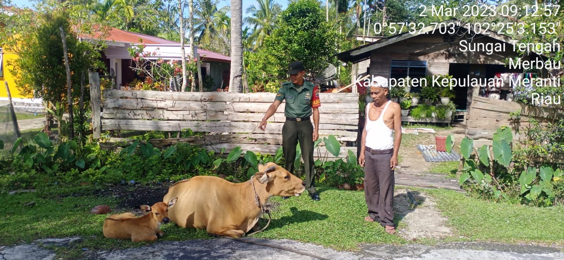 Untuk antisipasi hal tersebut Babinsa Koramil 06/Merbau Kodim 0303/Bengkalis rutin melakukan pemantauan dan pengecekan PMK pada hewan.