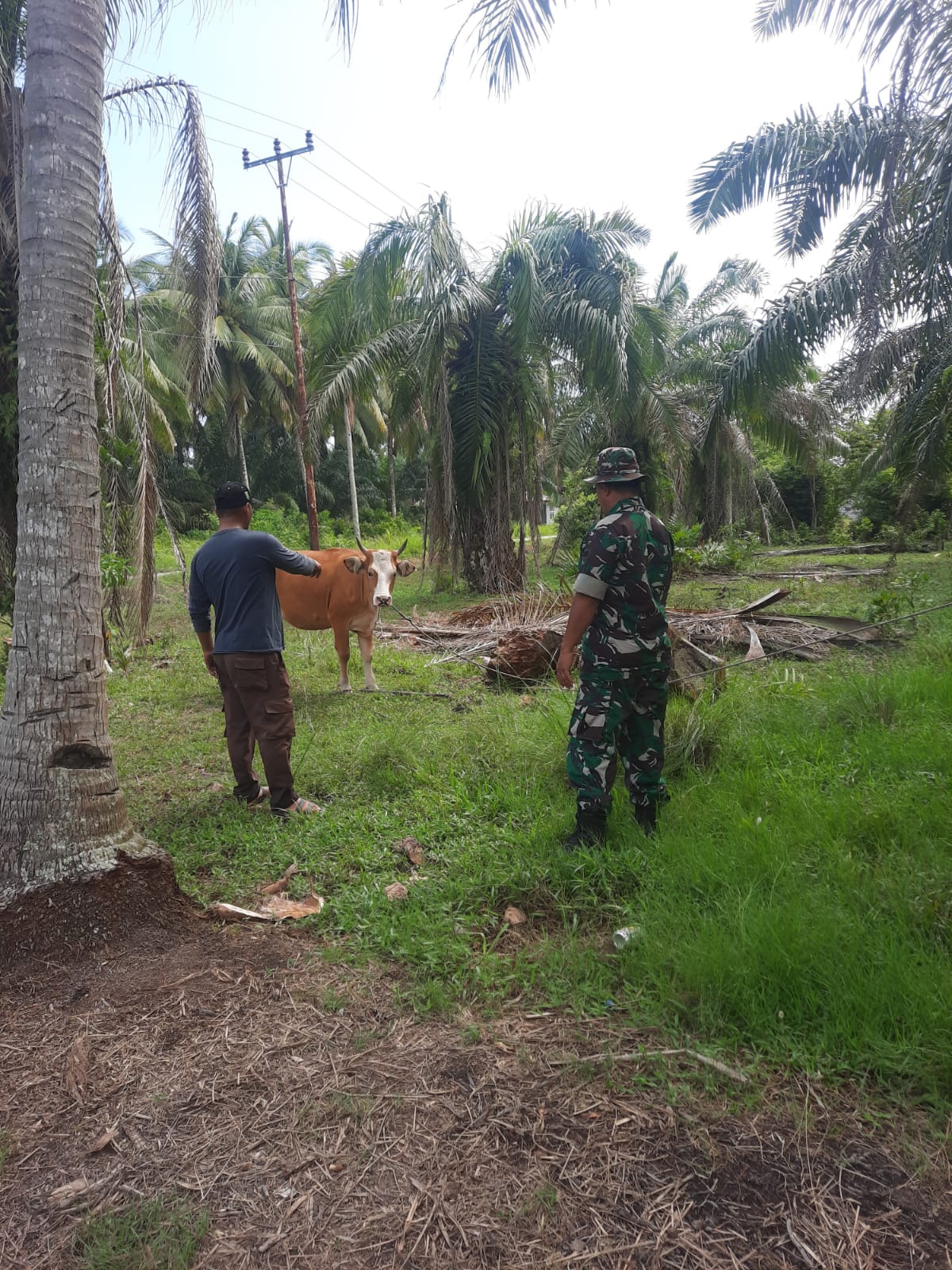 DUMAI (MR) - Pelda Hendrianto, Babinsa Kelurahan Pelintung Koramil PWK 04/MK, melaksanakan pemantauan dan pendampingan terhadap peternak sapi serta mensosialisasikan pencegahan penyakit mulut dan kuku pada Selasa, 7 Maret 2023.