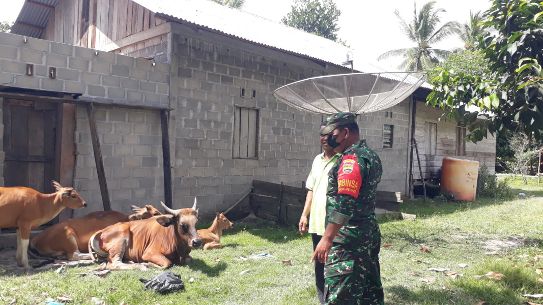 BENGKALIS (MR) - Cegah PMK, Pelda Albiker Nababan Babinsa Koramil 06/Merbau Kodim 0303/Bengkalis turut gencarkan pengecekan Hewan ternak di Desa Bandul Kecamatan Tasik Putri Puyu Kabupaten Kepulauan Meranti.