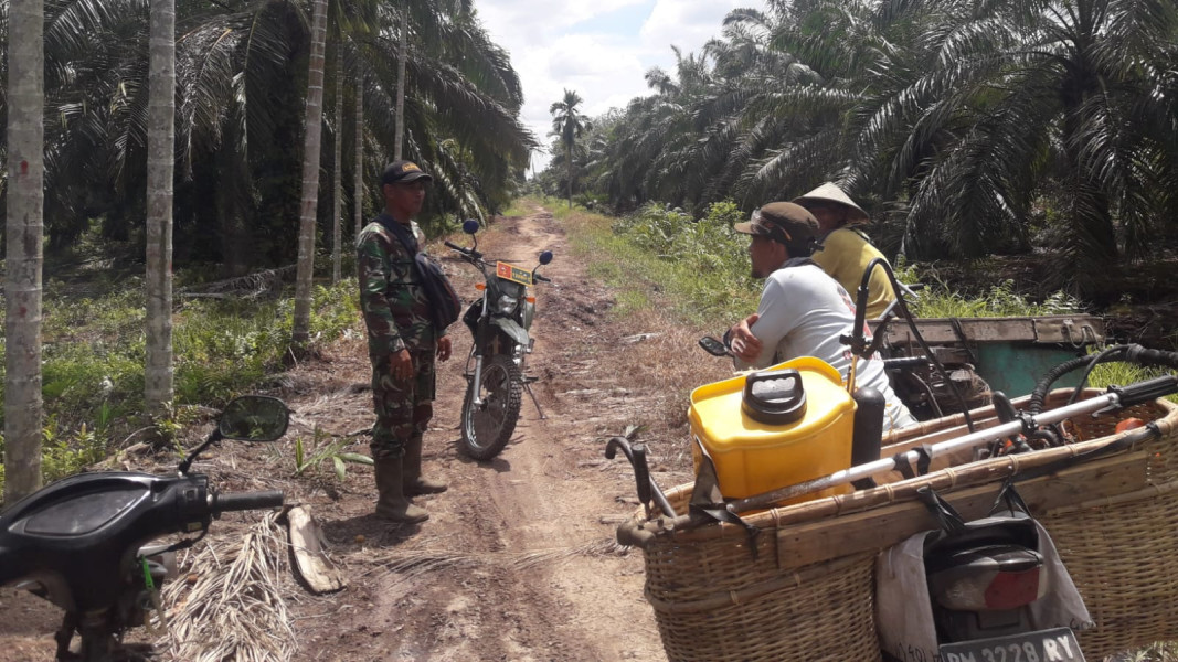 DUMAI (MR) - Babinsa Bangsal Aceh, Pelda Andre, melaksanakan patroli dan sosialisasi tentang Karhutla di wilayahnya pada Jum'at, 21 April 2023.