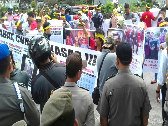 Demo di depan pagar masuk (Jalan Sudirman) Kantor Walikota itu, massa aksi membawa beberapa spanduk. Pada spanduk itu terdapat beberapa foto pejabat yang dianggap ikut menggerakkan massa.