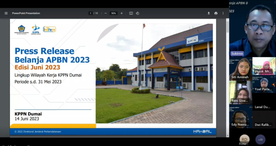 Kepala KPPN Dumai, Bapak Sukirno menyampaikan informasi mengenai Belanja APBN dan penyaluran dana transfer ke daerah sampai dengan 30 April 31 Mei 2023.
