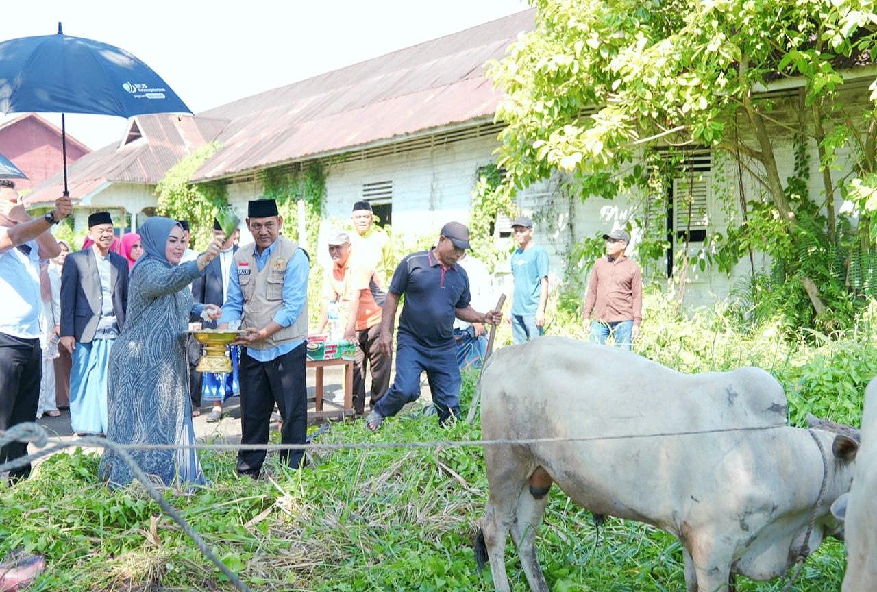 "Untuk disini kita menyembelih dua ekor sapi yang kami sediakan dari keluarga besar saya dan istri. Jadi ada 200 paket sembako dari Baznas dan 200 paket daging qurban dari kami," terangnya.