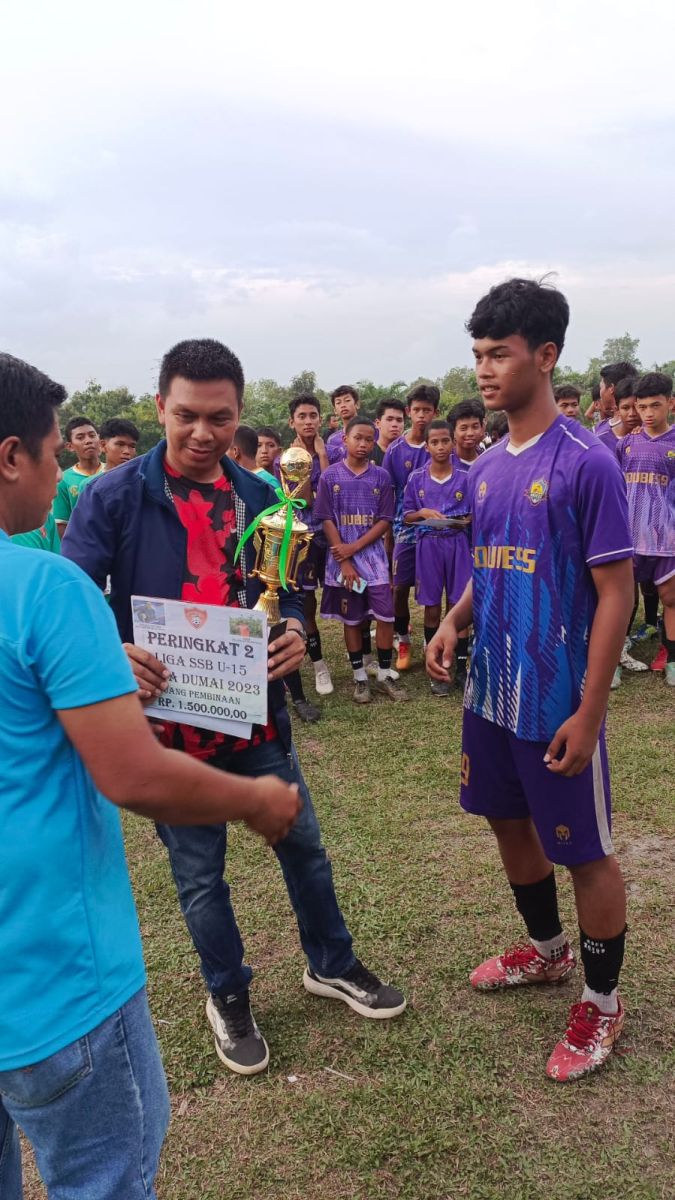 DUMAI (MR) - Duri Bengkalis Soccer School (DUBESS) berhasil meraih gelar Runner-up (juara 2) di liga SSB Kota Dumai. Setelah menerima piala U-17 beberapa pekan sebelumnya, Minggu (2/7/2023) DUBESS kembali menerima piala di kategori U-15 di Lapangan Dumai Putra, Dumai.