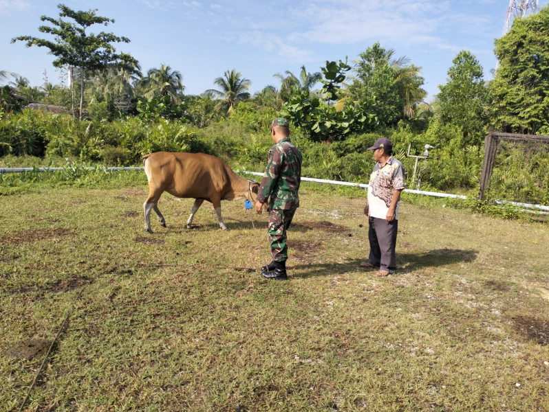 BENGKALIS (MR) - Dalam upaya mencegah penyebaran Penyakit Mulut dan Kuku (PMK), Praka Onki Alexander, Babinsa dari Koramil 06/Merbau Kodim 0303/Bengkalis, melaksanakan pengecekan PMK pada hewan di Kelurahan Teluk Belitung, Kecamatan Merbau, Kabupaten Kepulauan Meranti.