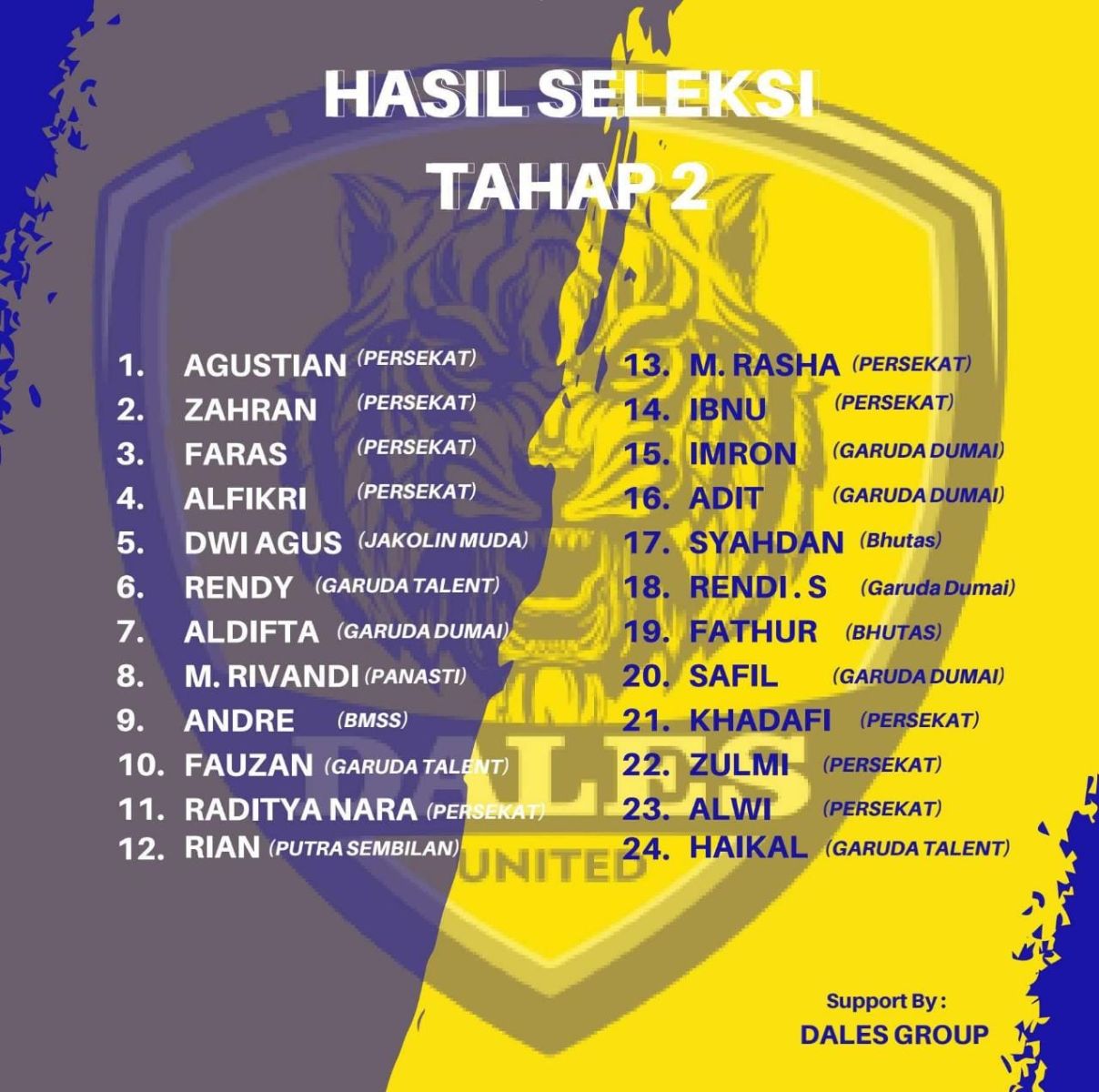 DUMAI (MR) - Seleksi tahap II Dales United yang akan berlaga di Kompetisi Soeratin Cup U-15 Zona Riau telah rampung dilaksanakan Jumat 11 Agustus 2023 sore tadi di Lapangan Sepakbola Purnama Dumai.
