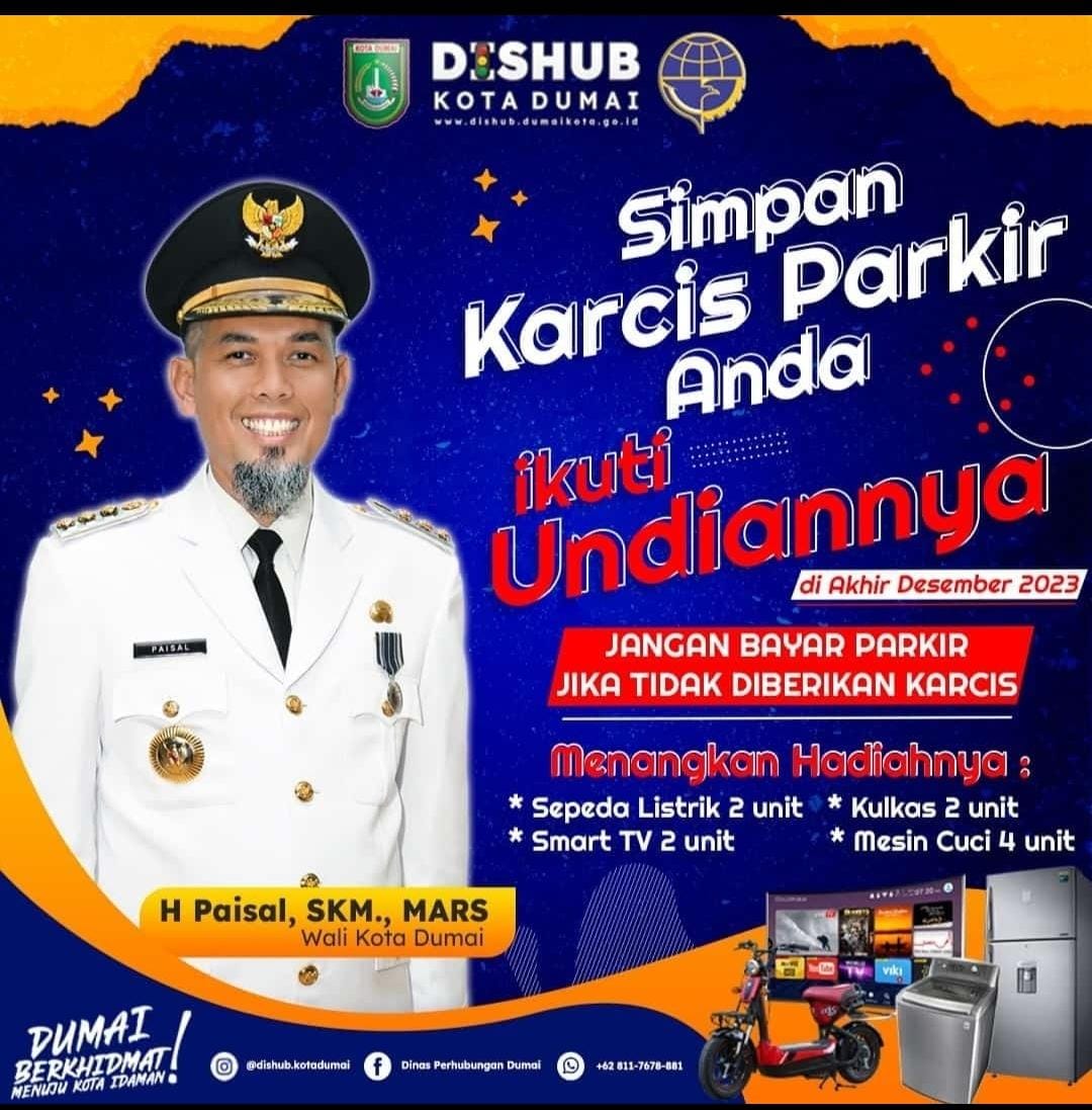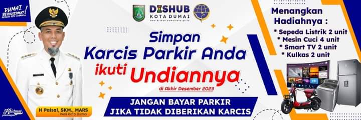DUMAI (MR) - Said Effendi, SE, selaku Kepala Dinas Perhubungan (Dishub) Kota Dumai, telah membuka kesempatan emas bagi masyarakatnya untuk memenangkan hadiah-hadiah menarik dengan cara yang tidak hanya bermanfaat bagi mereka sendiri, tetapi juga untuk meningkatkan Pendapatan Asli Daerah (PAD). Caranya adalah dengan berpartisipasi dalam membayar Retribusi Parkir di Tepi Jalan Umum.
