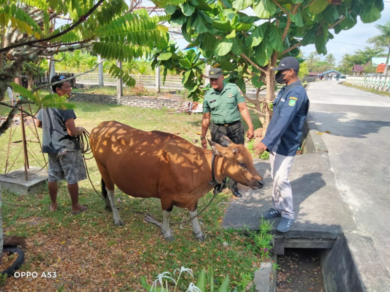 BENGKALIS (MR) - Serda Ansari, Babinsa Koramil 06/Merbau, Kodim 0303/Bengkalis, turut gencarkan pengecekan hewan ternak di Desa Padang Kamal, Kecamatan Pulau Merbau.