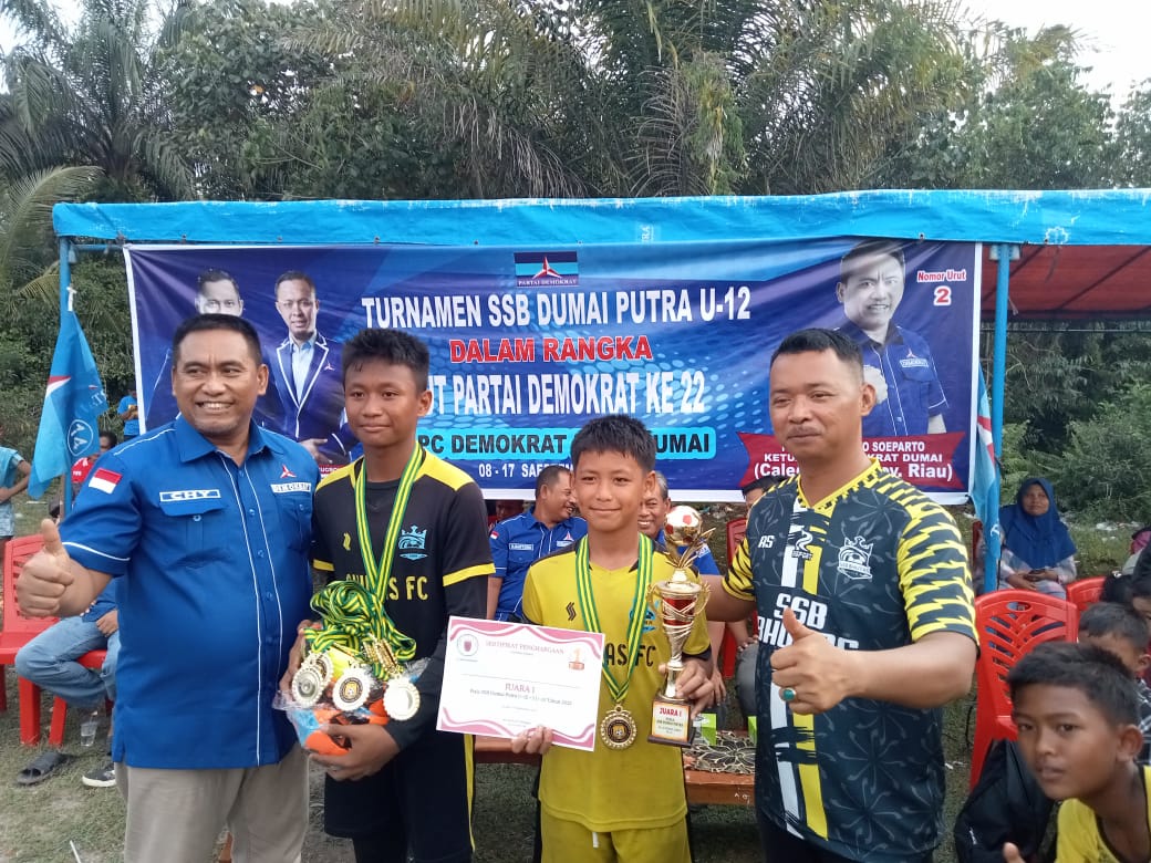 DUMAI (MR) - SSB Bhutas akhirnya keluar sebagai juara turnamen sepakbola U-12+5 yang diselenggarakan SSB Dumai Putra sempena HUT Partai Demokrat yang ke 22.