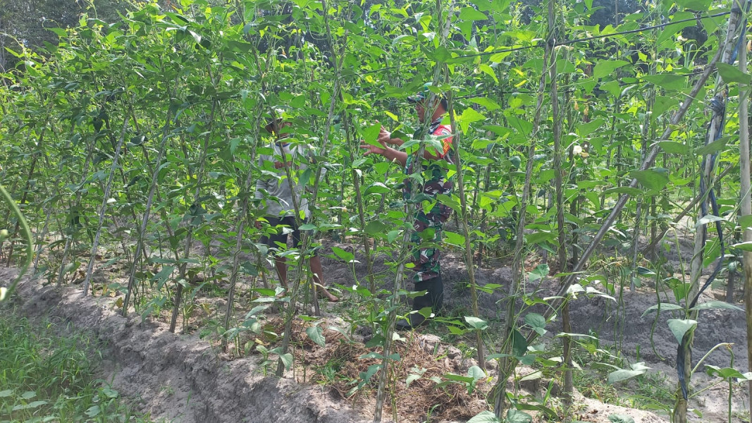 Dalam upaya meningkatkan produksi pangan lokal, Serda Roni Sandra turun langsung membantu Arman dalam merawat tanaman kacang panjangnya. Pendampingan ini mencakup berbagai aspek, termasuk pemeliharaan, pemupukan, dan pencegahan hama penyakit tanaman.