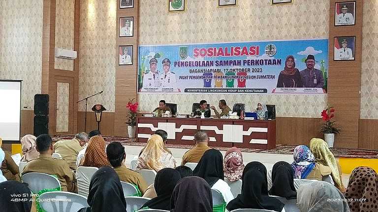 ROHIL (MR) - Dinas Lingkungan Hidup (DLH) Kabupaten Rokan Hilir bekerjasama dengan Pusat Pengendalian Pembangunan Ekoregion Sumatera (P3ES) Kementerian Lingkungan Hidup dan Kehutanan (KLHK), menggelar sosialisasi pengelolaan sampah perkotaan Kabupaten Rokan Hilir tahun 2023.