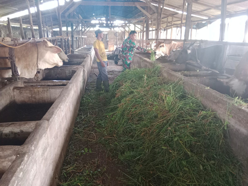 Sertu Mahyudin berbagi informasi kepada warga RT 05, khususnya kepada Dulah, pemilik ternak di lingkungan tersebut. Ia menjelaskan tentang betapa pentingnya menjaga kesehatan ternak, khususnya dalam mencegah Penyakit Mulut dan Kuku yang bisa merusak produksi ternak dan merugikan peternak.