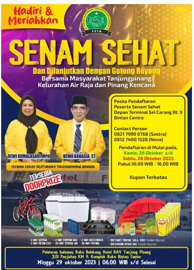 Bagi masyarakat yang ingin mengikuti kegiatan ini dapat mendaftar di posko di Depan Terminal Sei Carang, Km. 9, Bintan Centre, atau menghubungi Contact Person 0821 7990 0768 (Sastra) dan 0812 74001528 (Nova).