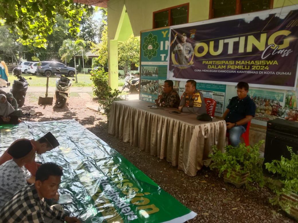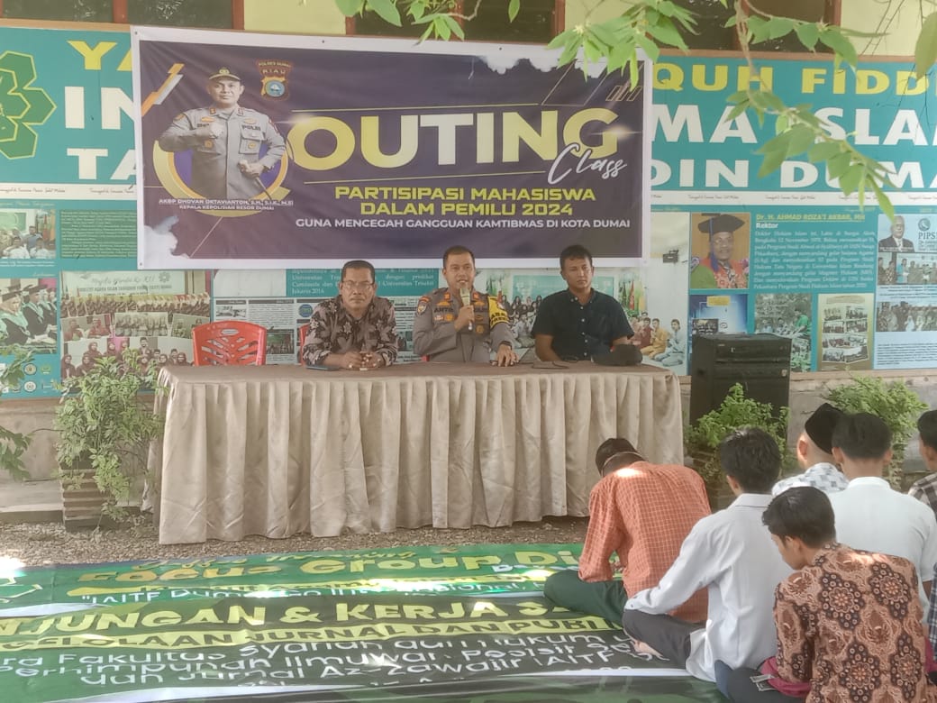 DUMAI (MR) - Polres Dumai, dipimpin oleh Kasat Binmas Polres Dumai melaksanakan kegiatan Cooling System dalam rangka Operasi Mantap Brata Lancang Kuning 2023-2024 Polres Dumai, dalam bentuk muatan kegiatan OUTING CLASS bertemakan PERAN MAHASISWA DALAM PEMILU 2024 guna terciptanya situasi kondusif di Kota Dumai melalui Edukasi dan penyuluhan pesan yang disampaikan kepada Mahasiswa sebagai pemilih pemula.