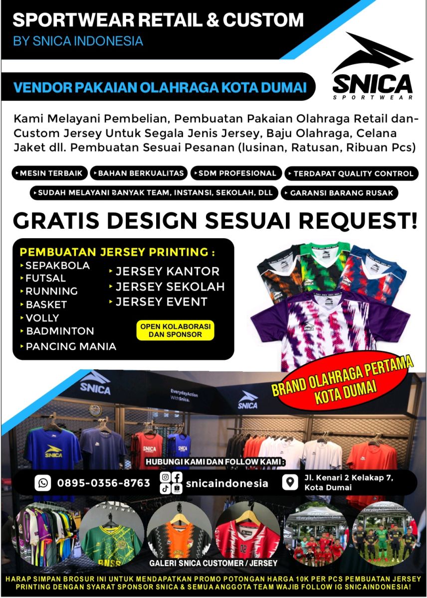 Bagi yang penasaran, dan juga ingin melihat langsung serta bertanya-tanya soal harga, langsung saja datang ke stan SNICA Sportwear di Jalan Sukajadi Dumai, tepatnya dekat Kopi-78 dan Bandrek Pak Haji, mulai pukul 17.00 WIB. Atau bisa melalui WA: 0895-0356-8763. ***