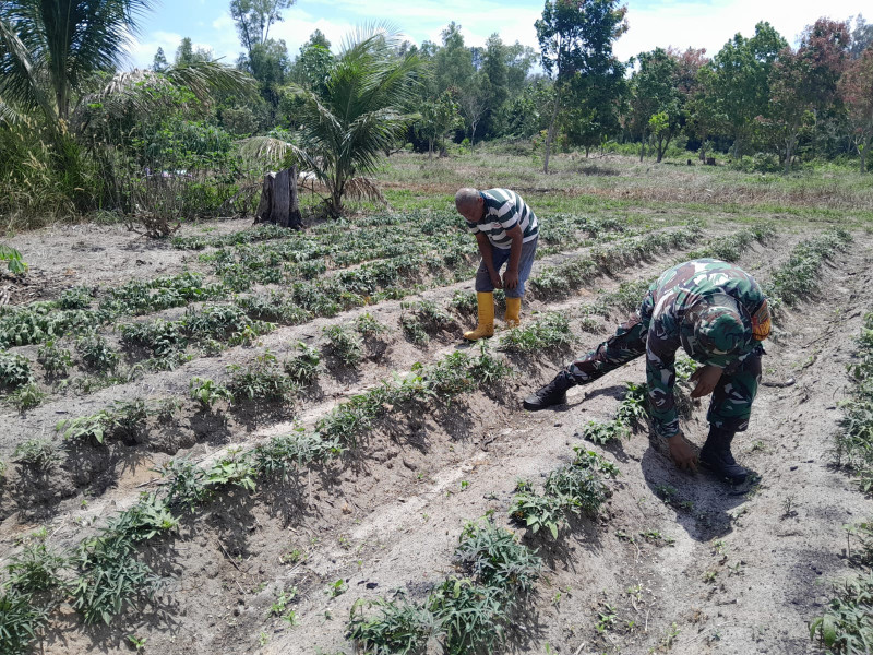 Selain itu, Serka F Purba juga membantu Dodi dalam melakukan penanaman bibit ubi jalar di kebunnya.