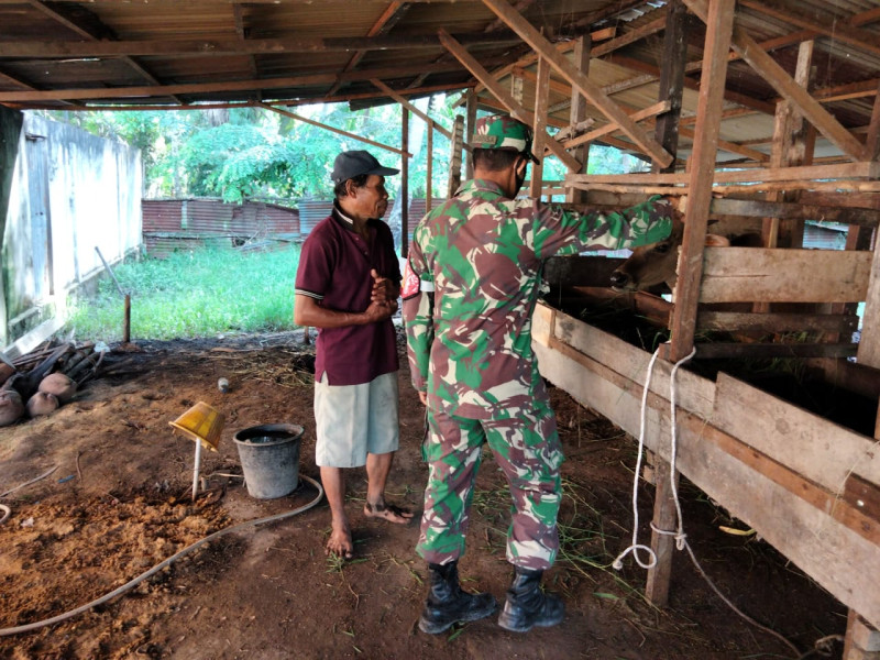 DUMAI (MR) - Babinsa Kelurahan STDI, Kecamatan Dumai Barat, Sertu Sugianto, melaksanakan sosialisasi pencegahan Penyakit Mulut dan Kuku (PMK) di peternakan Jalan Dermaga, yang merupakan milik Tarji, (21/2).