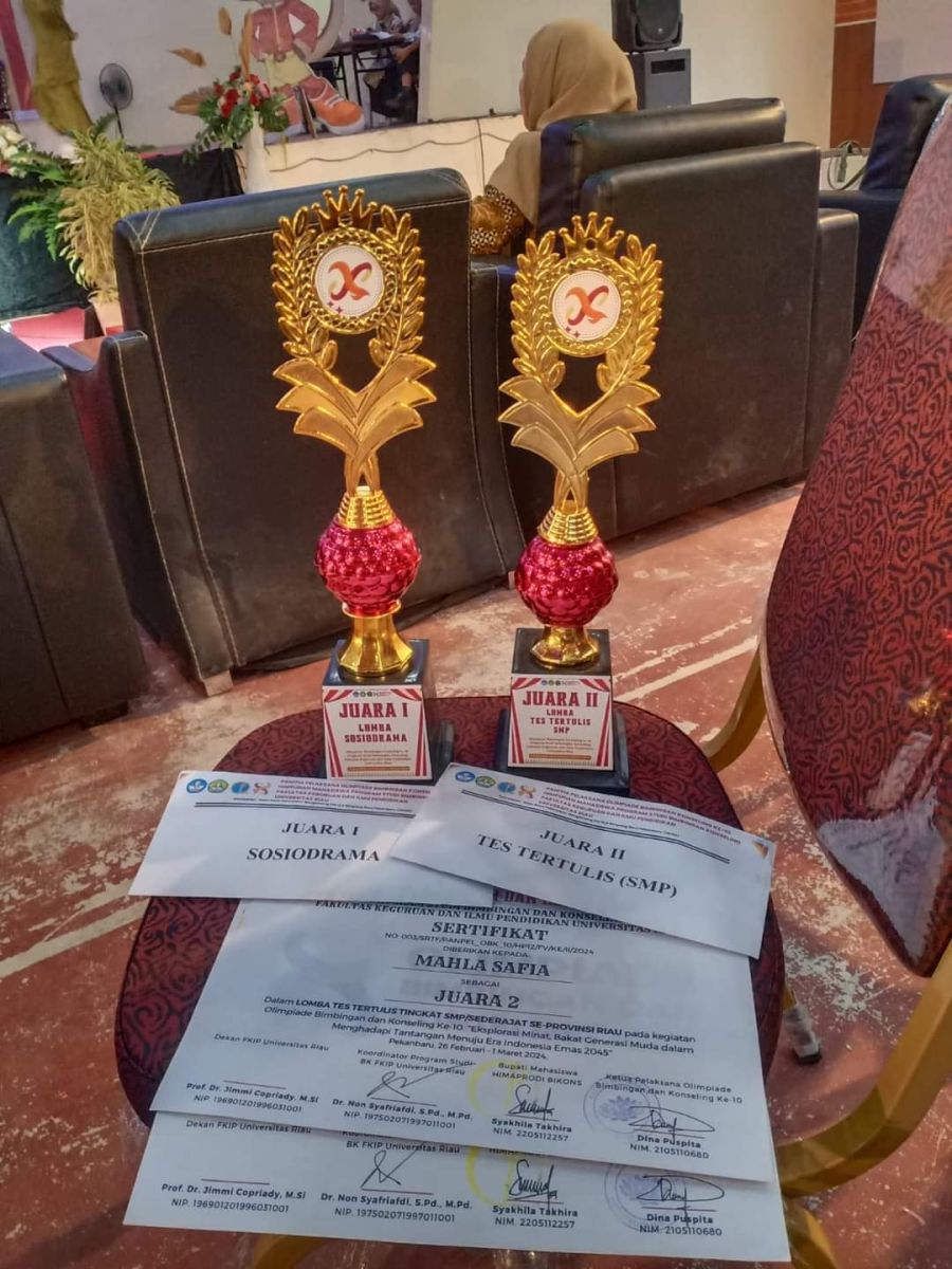 Juara 1 Sosiodrama antar SMP-SMA Sederajat Se- Prov. Riau. (1 Tim) dan Juara 2 Tes Tertulis antar SMP Sederajat Se-Prov. Riau, atas nama Mahla Safia.