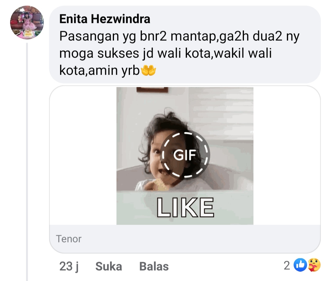 "Pasangan yg bnr2 mantap,ga2h dua2 ny moga sukses jd wali kota,wakil wali kota,amin yrb" Tulis Enita Hezwindra.