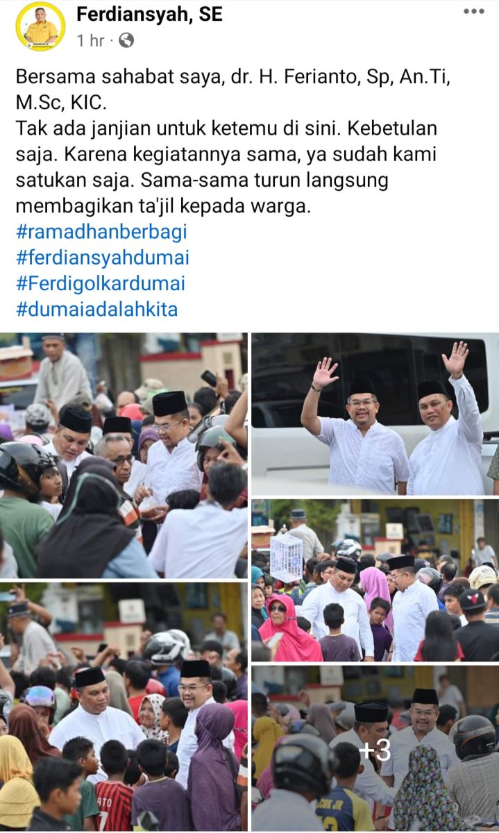 "Bersama sahabat saya, dr. H. Ferianto, Sp, An.Ti, M.Sc, KIC. Tak ada janjian untuk ketemu di sini. Kebetulan saja. Karena kegiatannya sama, ya sudah kami satukan saja. Sama-sama turun langsung membagikan ta'jil kepada warga." Begitu tulisan yang disertai 7 foto yang menampilkan kemesraan mereka berdua.