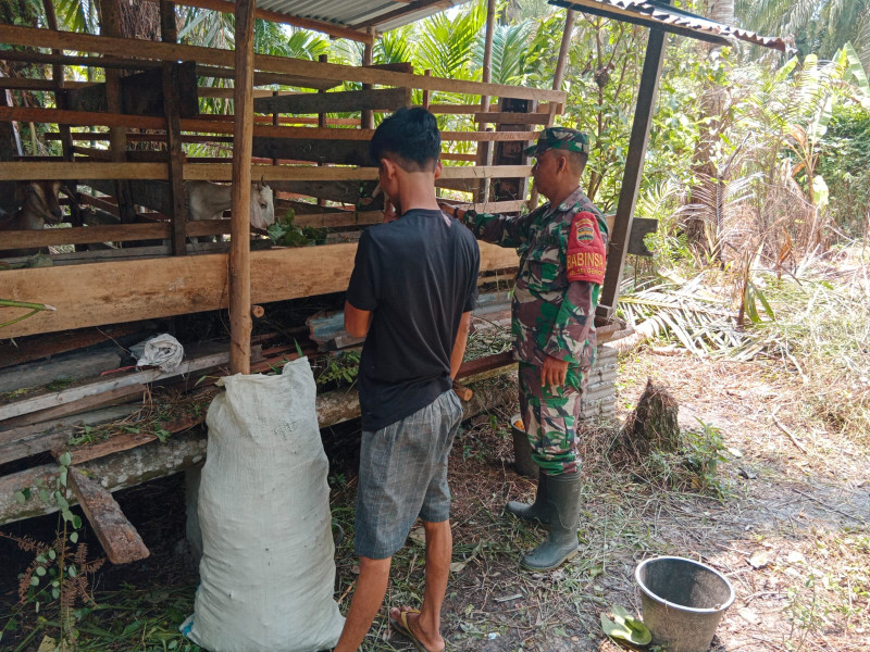DUMAI (MR) - Babinsa Kelurahan Sei Geniot Serda Bambang Irwanto dari Koramil 03/Sungai Sembilan melaksanakan pemantauan dan pendampingan peternak sapi, serta melakukan sosialisasi tentang Penyakit Mulut dan Kuku (PMK) di Basilam Baru, Kelurahan Sei. Geniot, Kecamatan Sei. Sembilan.