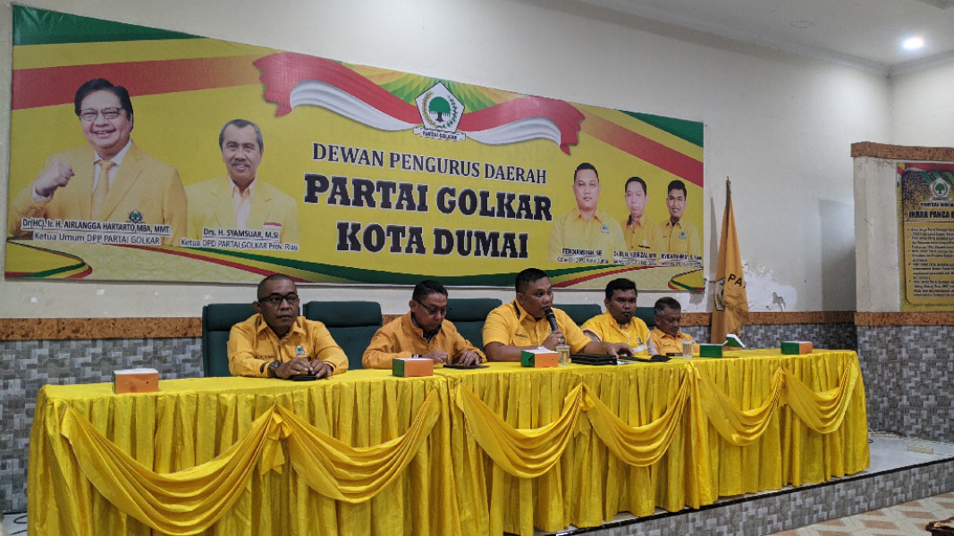 DUMAI (MR) - Partai Golkar Dumai menggelar konferensi pers di Aula Kantor Golkar, yang dihadiri oleh Ketua DPD Partai Golkar Dumai, Ferdiansyah, SE, beserta Sekretaris Dr. Ir. H. Yusrizal, MM, Bendahara Devisa Rahmat, S.Kom, Ketua PK, tokoh masyarakat, dan tokoh senior partai Golkar, (15/5).