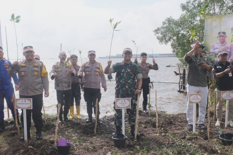 DUMAI (MR) - Letkol Inf Antony Tri Wibowo, Dandim 0320/Dumai, menghadiri kegiatan penanaman pohon, ketahanan pangan, dan penyerahan beasiswa dalam rangka HUT Bhayangkara Ke-78 Tahun 2024 di Pantai Purnama, Dumai.