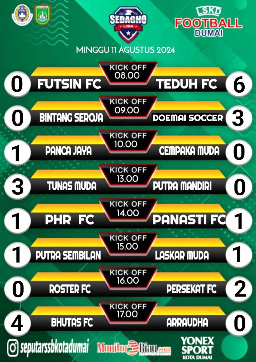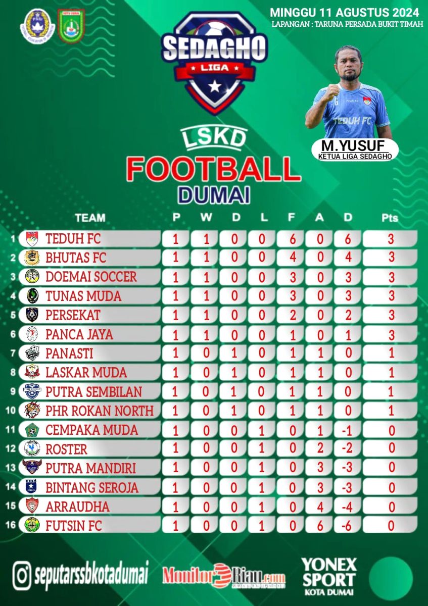 Liga Sedagho Kota Dumai ini diikuti oleh 15 tim lokal Dumai dan ditambah 1 tim undangan dari Duri, yakni SSB PHR Duri. Pertandingan akan dilaksanakan setiap hari Sabtu dan Minggu. ****