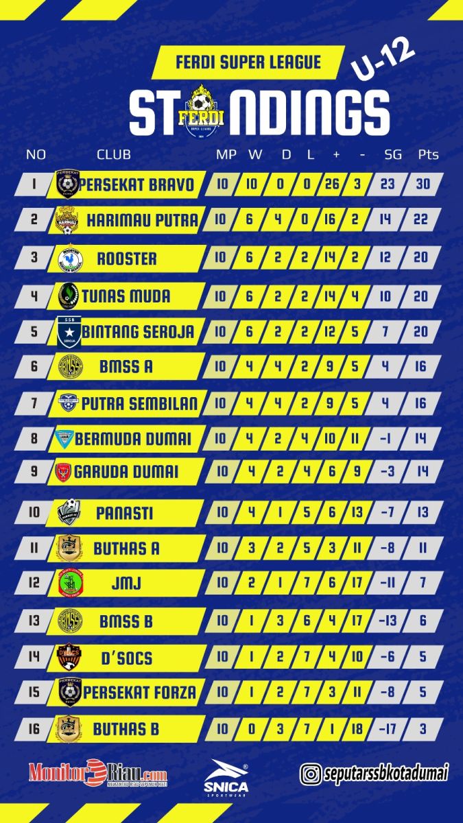 Sedangkan di Kategori U-12, Persekat Bravo mendominasi liga dengan raihan poin sempurna 30 atas 10 kemenangan beruntun. Anak asuh Coach Senior Isman Taher itu belum terbendung dan nyaman di pucuk klasemen.