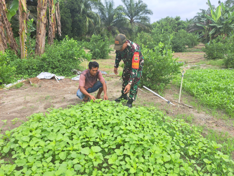 DUMAI (MR) - Dalam rangka mendukung ketahanan pangan lokal, Babinsa Kelurahan Bukit Datuk, Koramil-01/Dumai, Kodim 0320/Dumai, Serda Andri Widodo, melaksanakan pendampingan karya nyata kepada petani sayur bayam di RT 01, Senin (6/1).
