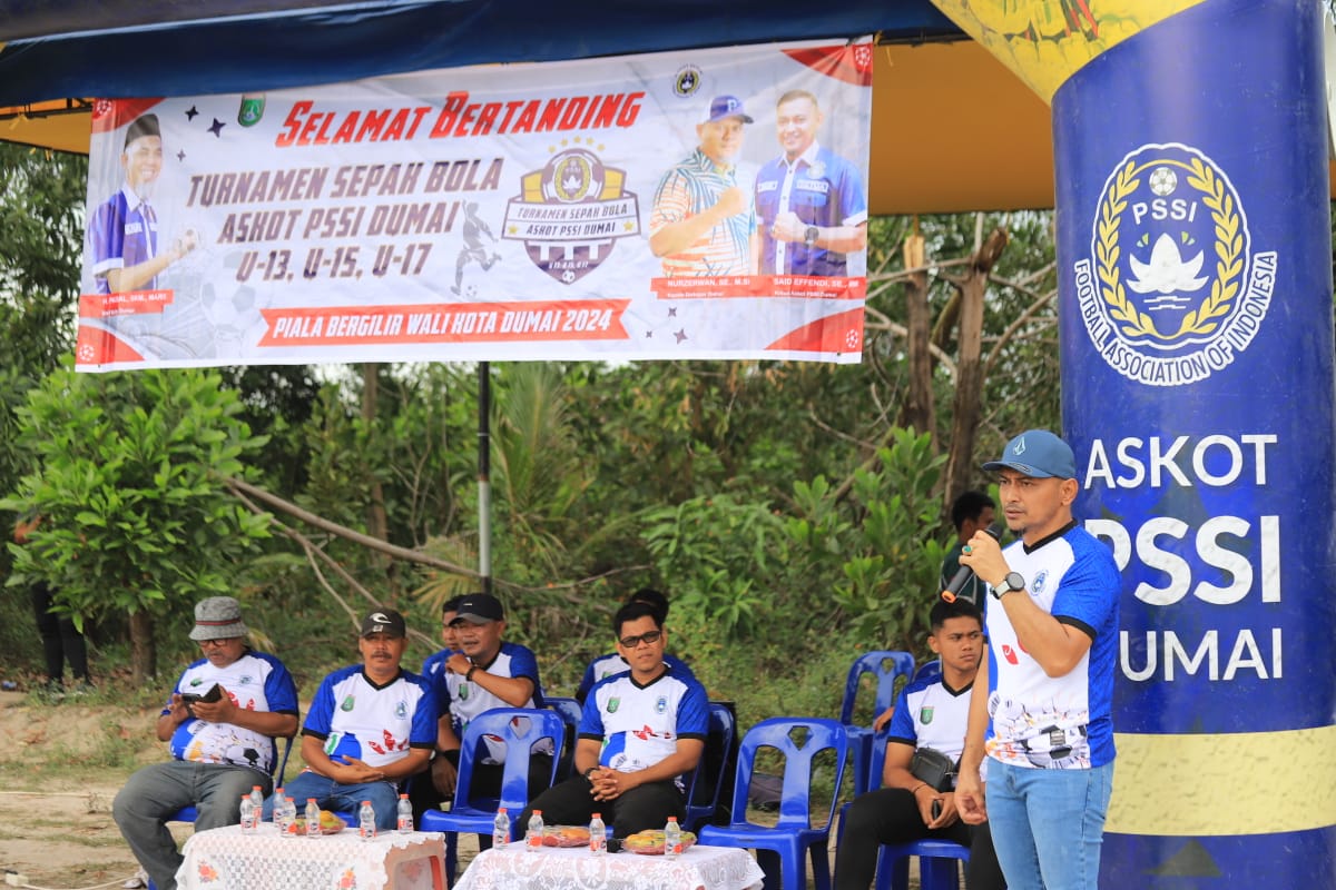 DUMAI (MR) - Ketua ASKOT PSSI Kota Dumai Said Effendi SE MM membuka secara resmi kompetisi ASKOT PSSI Dumai U-13 U-15 dan U-17 di lapangan SMK Taruna Persada Bukit Timah Dumai, Sabtu (20/09/2024) pagi.