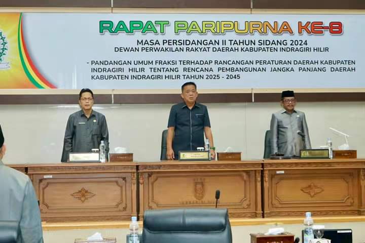 TEMBILAHAN (MR) - Dewan Perwakilan Rakyat Daerah Kabupaten Indragiri Hilir menggelar Rapat Paripurna ke-8 Masa Persidangan II Tahun Sidang 2024, tentang pandangan umum fraksi terhadap Rencana Pembangunan Jangka Panjang Daerah (RPJPD), Senin (24/6/2024).