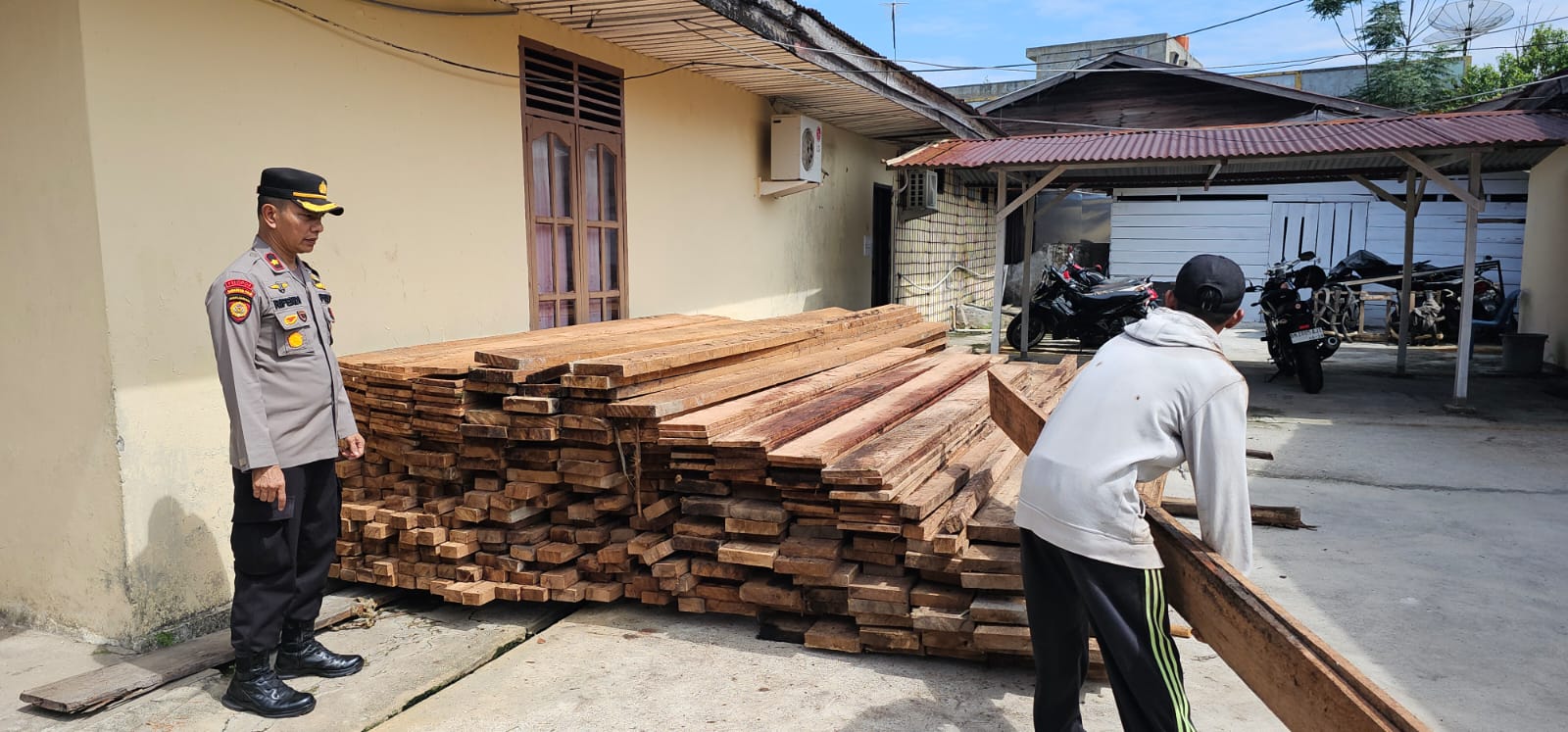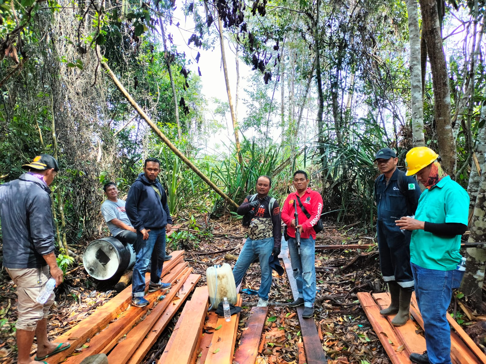 Selanjutnya Team Opsnal Polsek Bukit Batu yang dipimpin langsung oleh Kanit Reskrim Polsek Bukit Batu melaksanakan Patroli dengan menggunakan speed Milik Scurity PT BBHA, kemudian team menulusuri areal yang menjadi pembalakan liar/ilegal logging dan Menemukan adanya Rakitan/ Tumpukan Kayu Hasil olahan Ilegal Loging, dan dengan Sigap Team mengamankan 5(Lima) orang pelaku yang diketahui sebagai pemodal, tukang tebang, lansir kayu, kemudian team menemukan +/- 8 Kubik Kayu Olahan, 2 unit mesin Chainsaw kemudian dari hasil interogasi di lap bahwa (AZ) pemilik modal, (ZM, AM) dan (BS) bertugas sebagai Pemotong kayu (operator chainsaw), dan (MR) sebagai tukang pikul. kemudian team mengamankan terlapor dan barang bukti di Polsek Bukit Batu Guna Menjalani Pemeriksaan lebih lanjut.