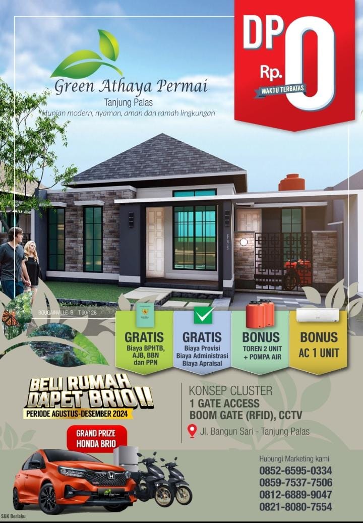 Green Athaya Permai bukan hanya sekadar hunian, tetapi juga investasi masa depan bagi Anda dan keluarga. Dengan DP 0 persen dan berbagai bonus menarik, kini saatnya Anda wujudkan impian memiliki rumah yang nyaman dan modern.