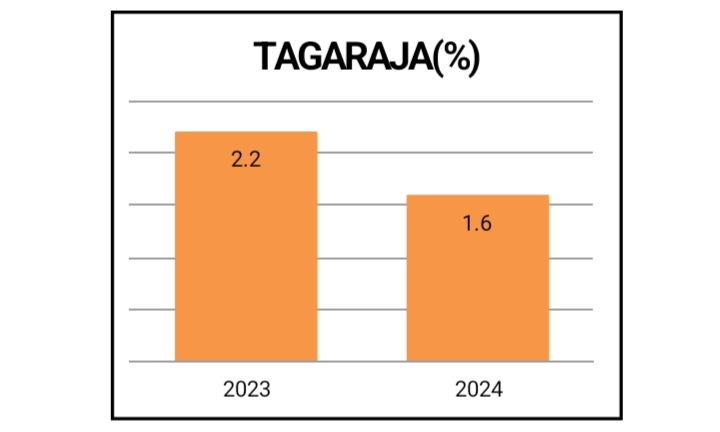 Dari grafik dan peta di atas menunjukkan bahwa terjadi penurunan persentase balita Stunting di Kelurahan Tagaraja di tahun 2023 yaitu 2,2% dan 2024 yaitu 1,6%. Beberapa upaya yang telah dilakukan guna menurunkan angka stunting melalui perbaikan gizi di masa 1.000 Hari pertama Kehidupan (HPK), antara lain dengan pemberian TTD pada Ibu hamil, melakukan sosialisasi ASI Ekslusif, Pemberian makan pada Bayi,dan Anak (PMBA), Pemberian Vitamin A, melakukan pemantauan tumbuh kembang, serta program penyehatan lingkungan, penyediaan sarana dan prasarana air bersih dan sanitasi.
