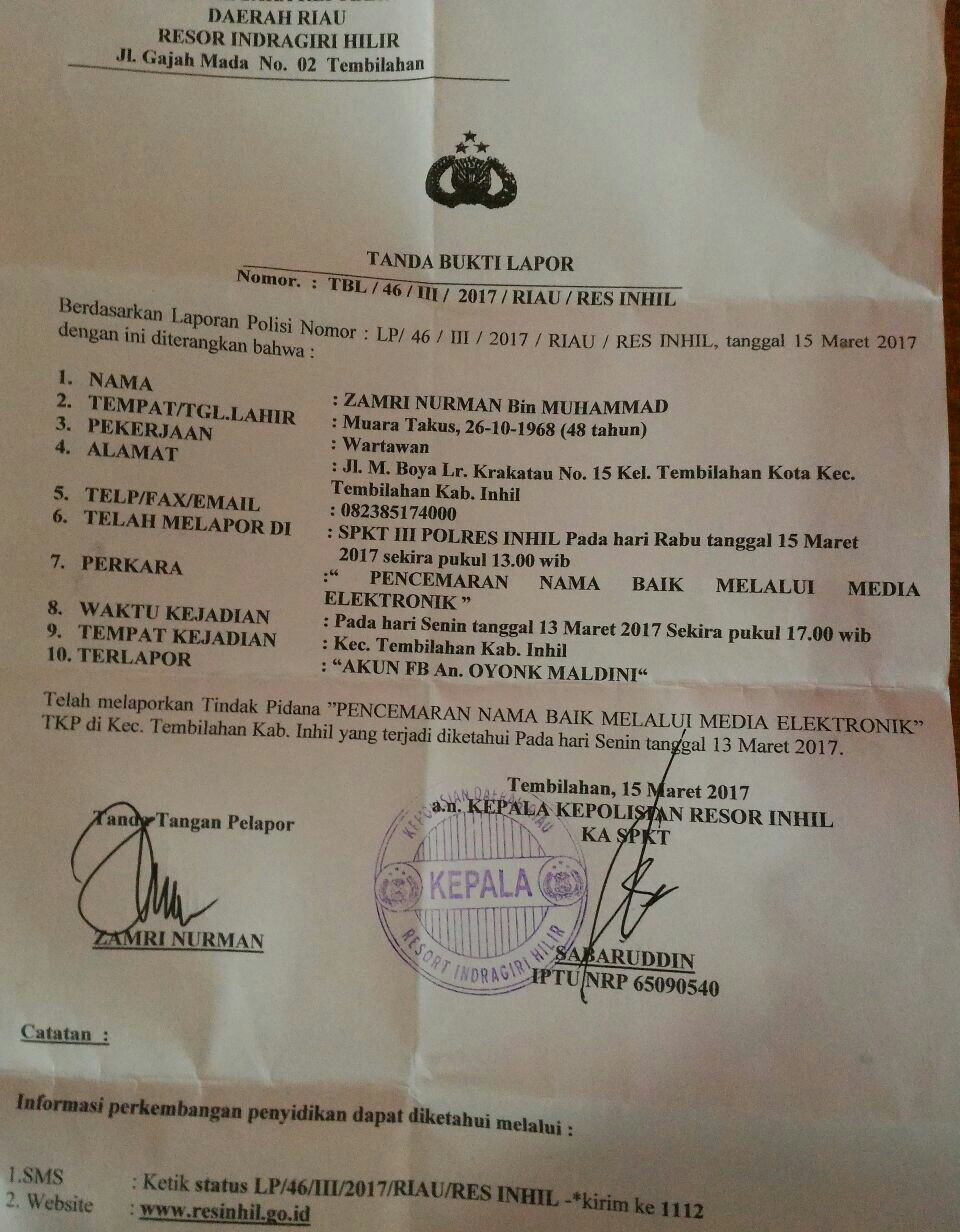 TEMBILAHAN (MR) - Sekumpulan wartawan yang tergabung dalam Aliansi Wartawan Inhil (AWI) akhirnya resmi melaporkan akun Facebook atas nama Oyonk Maldini ke Mapolres Indragiri Hilir (Inhil), Rabu (15/3/2017) kemarin.