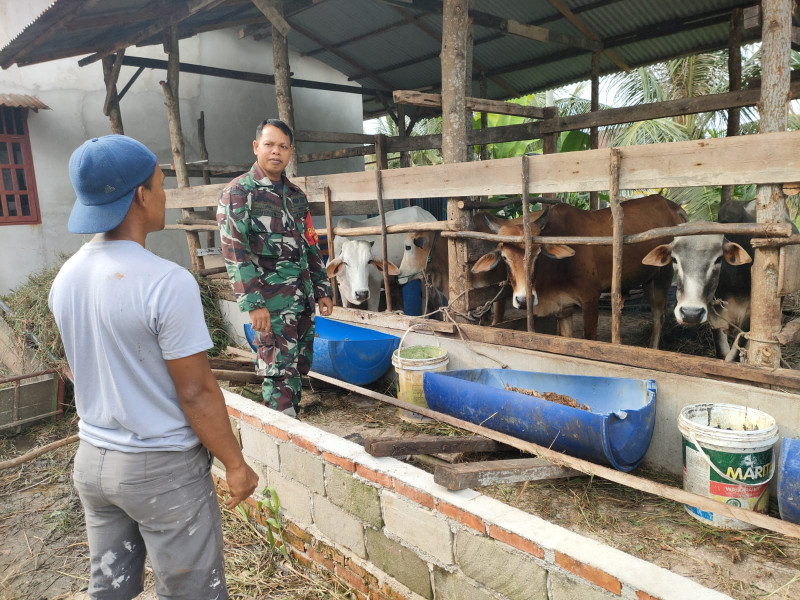 Dalam kesempatan tersebut, Babinsa mendampingi pemilik ternak Zaini untuk memastikan kesehatan sapi yang dipelihara serta memberikan pemahaman tentang pencegahan penyakit.