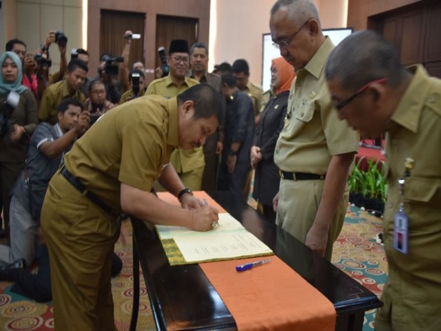 Diakhir acara, kepala daerah se-Provinsi Riau bersama Gubernur Riau melakukan penandatanganan hasil musrembang Provinsi Riau tahun 2017.*** (humas)