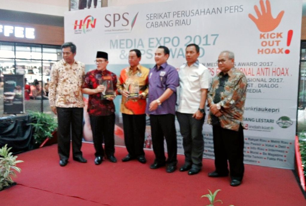 TEMBILAHAN (MR) - Bupati Indragiri Hilir (Inhil) HM Wardan menerima award dari Serikat Perusahaan Pers (SPS) Provinsi Riau dalam katagori relasinship di Mal SKA, Minggu (26/3/2017) kemarin.