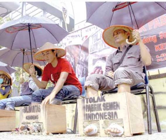 PEKANBARU (MK) - Sebagai bentuk aksi solidaritas penolakan pembangunan pabrik semen Indonesia, di Jawa Tengah, sebanyak tiga aktivis dari Lembaga Bantuan Hukum (LBH) Pekanbaru dan dua orang dari Wahana Lingkungan Hidup (WALHI) Riau melakukan semen kaki di Tugu PON Jalan Cut Nyak Dien Pekanbaru, Rabu (29/3).