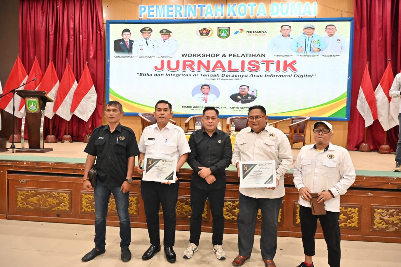 DUMAI (MR) – Persatuan Wartawan Indonesia (PWI) Kota Dumai menggelar Workshop dan Pelatihan Jurnalistik bertajuk "Etika dan Integritas di Tengah Derasnya Arus Informasi Digital" pada Senin (25/8/2025), bertempat di Balai Sri Bunga Tanjung. Acara ini dibuka secara resmi oleh Wakil Wali Kota Dumai, Sugiyarto, dan diikuti oleh 60 peserta yang merupakan wartawan dari berbagai organisasi pers di Dumai.