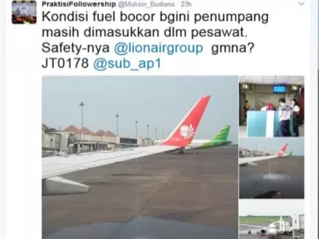 "Kondisi fuel bocor bgini penumpang masih dimasukkan dlm pesawat. Safety-nya @lionairgroup gmna? JT0178 @sub_ap1," demikian tulis akun tersebut beberapa waktu lalu.*** (okz)