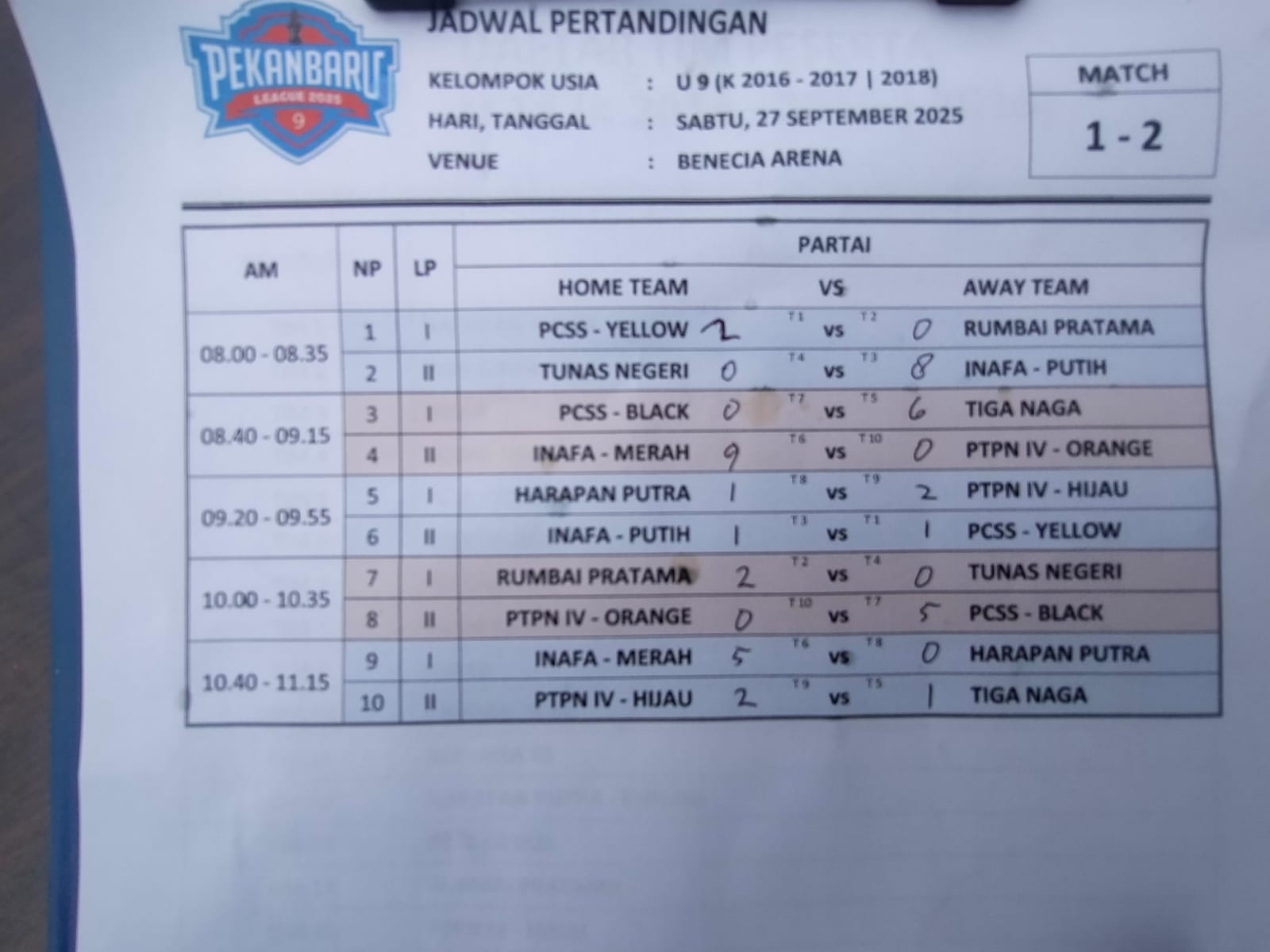 "Hari ini kita mempertandingkan 10 laga di usia 9 sementara untuk U11 akan dimulai Ahad 28 September 2025.Dan pekan depan insya Allah ak dibuka Walikota Pekanbaru bapak Agung Nugroho, "katanya.
