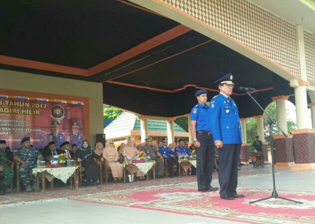 TEMBILAHAN (MR) - Bupati Indragiri Hilir (Inhil) HM Wardan memimpin Upacara Bendera Hari Kesadaran Nasional yang disejalankan dengan Hari Ulang Tahun (HUT) Pemadam Kebakaran (Damkar) Ke-98, HUT Polisi Pamong Praja (PP) Ke-67 dan Satuan Perlindungan Lingkungan Masyarakat (Linmas) Ke-55 Tahun 2017 di lapangan Gajah Mada Tembilahan, Senin (17/4/2017).